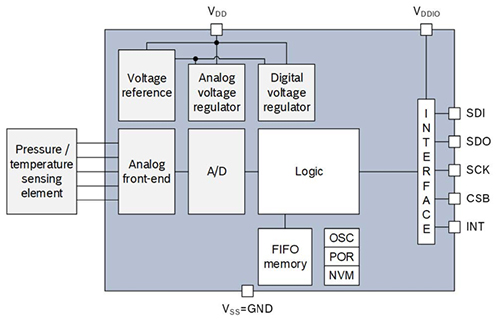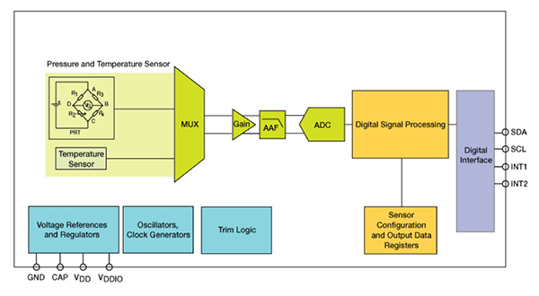 LGA 封裝帶孔,允許外部壓力到達(dá)傳感元件。該傳感器為壓阻式傳感器,包括檢測(cè)元件和一個(gè)通過(guò) I2C 或 SPI 將檢測(cè)元件連接到應(yīng)用的 IC 接口。