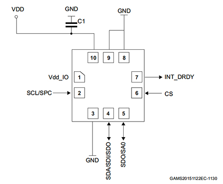 另外,使用 I2C 接口時(shí),CS(引腳 6)必須連接到 VDD_IO(引腳 1)。