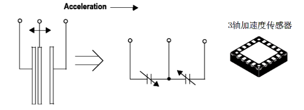 目前的加速度傳感器有多種實現(xiàn)方式,主要可分為壓電式、電容式及熱感應(yīng)式三種,這三種技術(shù)各有其優(yōu)缺點。以電容式3軸加速度計的技術(shù)原理為例。電容式加速度計能夠感測不同方向的加速度或振動等運動狀況。其主要為利用硅的機械性質(zhì)設(shè)計出的可移動機構(gòu):由于加速度使得機械懸臂與兩個電極之間的距離發(fā)生變化,從而改變了兩個電容的參數(shù)。通過集成的開關(guān)電容放大電路量測電容參數(shù)的變化,形成了與加速度成正比的電壓輸出。因此3軸加速度傳感器必然包含一個單純的機械性MEMS傳感器和一枚ASIC接口芯片兩部分,前者內(nèi)部有成群移動的電子,主要測量XY及Z軸的區(qū)域,后者則將電容值的變化轉(zhuǎn)換為電壓輸出。