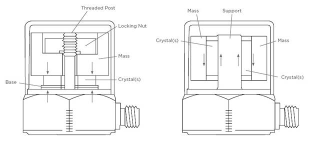 壓縮模式設計通過在壓電晶體頂部加載一個質(zhì)量塊并施加預載力以使壓電晶體受壓來實現(xiàn)。由于性能限制,此類設計已經(jīng)過時,不再那么流行。這類結構容易受到安裝基座應變的影響,且具有較高的熱漂移。
