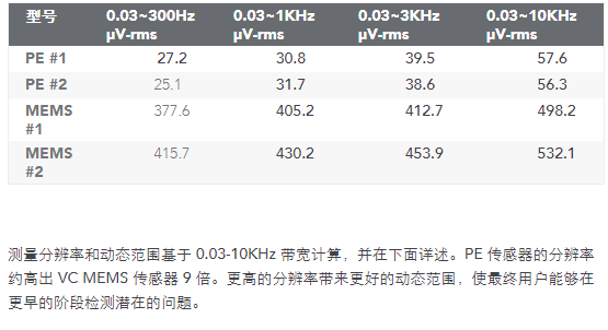 測試結(jié)果說明如下。假設(shè)最大 ±1dB 的幅度偏差作為可用帶寬,但帶寬容差通常使用 ±5% 的更嚴(yán)格的偏差。數(shù)據(jù)表明,VC MEMS 傳感器的可用帶寬高達(dá) 3KHz,而壓電傳感器的可用帶寬 >10KHz(該特定 PE 傳感器的可用帶寬在最高 14KHz 的規(guī)格范圍內(nèi))。