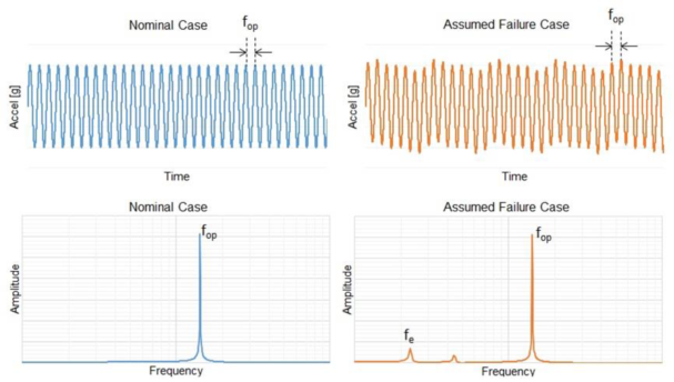 假設fop為機械系統(tǒng)(比如旋轉電機)的工作頻率,fe為系統(tǒng)的錯誤/故障模式頻率(圖3)。在此例中,fe低于fop并且在該圖中顯示,也就是說,由于機身松動,電機正在緩慢振動。對于傳統(tǒng)加速度傳感器,為了檢測這種故障模式,人們需要用MCU/DSP進行頻率分析。而MCU/DSP一直保持工作狀態(tài),會導致額外的內(nèi)存空間需求以及更高的功耗。