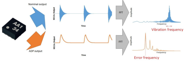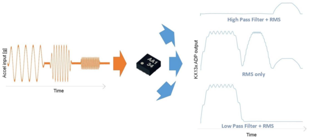 現(xiàn)實世界中的加速度信息(左)由不同頻率和振幅混合而成,KX13x的ADP不僅可以捕獲這些信息,而且能夠輸出指定頻率范圍內(nèi)的加速度振幅(右側列舉了各種情況示例)。