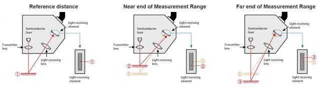 激光位移傳感器將三角測量與發(fā)射和接收透鏡配合使用。激光束通過透射透鏡射向目標(biāo)。然后,光反射回傳感器,并由接收器透鏡導(dǎo)向接收元件。隨著目標(biāo)越來越近,反射光的角度會發(fā)生變化(聚焦在接收元件上的不同位置)。位移傳感器在防止使用加速度計(例如旋轉(zhuǎn)部件)或加速度計的質(zhì)量會對系統(tǒng)運(yùn)動產(chǎn)生太大影響的應(yīng)用中是首選。
