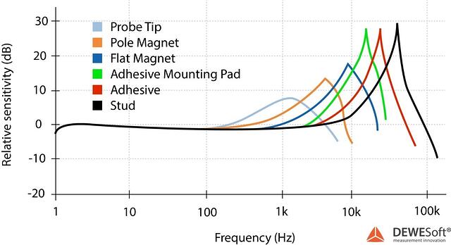 圖1: 不同安裝方式的加速度計的頻率響應。從DEWESoft的“振動測量課程”中拍攝和修改的圖像(值得一試!)。