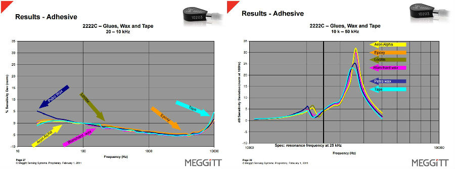 安裝加速度計時,需要考慮幾種不同的粘合劑。但是,令人驚訝的是,對于加速度計性能而言,最重要的參數(shù)不是膠粘劑類型,而是膠粘劑的厚度發(fā)揮了最大作用。圖4 提供了不同膠粘劑的頻率響應的一些曲線圖(數(shù)據(jù)來自相同的Endevco展示),說明了兩者之間的微小差異。