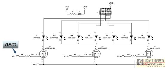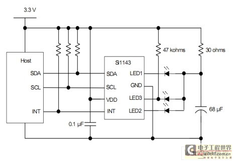 與Si1120不同的是,Si1143帶了三個(gè)LED驅(qū)動(dòng),當(dāng)連接多個(gè)紅外LED時(shí),如果只有單個(gè)LED驅(qū)動(dòng)(如圖6所示),則需通過(guò)MCU來(lái)控制MOS管分時(shí)驅(qū)動(dòng)LED,而Si1143(如圖7所示)本身就已具備3個(gè)LED驅(qū)動(dòng),所以可以直接連接到不同的LED 引腳,勿需再另加外圍器件,為硬件設(shè)計(jì)節(jié)省了成本。另外,Si1143采用?SMBus接口,可兼容I2C通訊,通用性更強(qiáng),同時(shí)也方便軟件的設(shè)計(jì)。