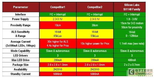 Si1140系列紅外接近傳感器與競(jìng)爭(zhēng)對(duì)手在一些性能上的對(duì)比(如圖8所示):