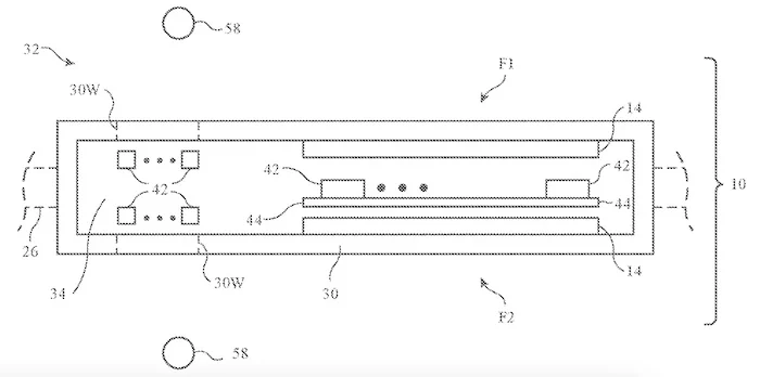 蘋果公司的紅外專利申請顯示了一個外殼的簡單橫截面圖,其中包含諸如PCB(標記為44),組件(標記為42)和以窗口布置方式顯示的光學元件(標記為30W)之類的元件。