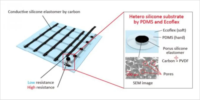 在發(fā)表的論文中,研究人員描述了使用兩種不同的材料(一種軟材料和一種硬材料)來保護傳感器伸展和準確測量運動的能力。將硬硅樹脂(PDMS)沿著陣列上的電極放置,并在每個放置的核心處放置可感測壓力的柔軟的多孔硅樹脂。