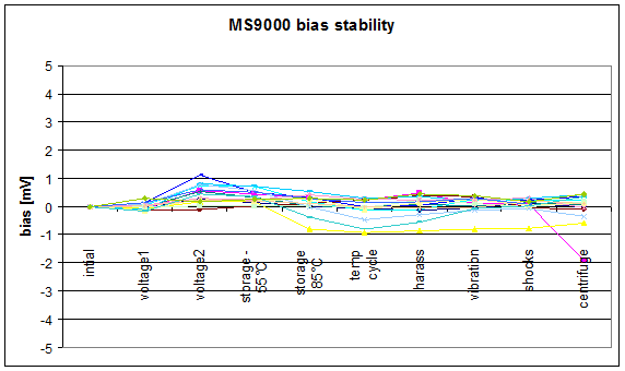 對于量程為±10g的測量,它們總的長期零偏穩(wěn)定性優(yōu)于7.5mg,對于量程±5g,優(yōu)于3.75mg,其標度因數(shù)重復性優(yōu)于400ppm。圖1顯示了對于各種量程MS9000.D的一年零偏穩(wěn)定性的測量結(jié)果。該分析結(jié)果還包括:在85°時進行10天的加速老化實驗,這對應于18個月的標準壽命時間,以及對加速度傳感器為期0.2毫秒,1000g的從六個方向進行的沖擊。