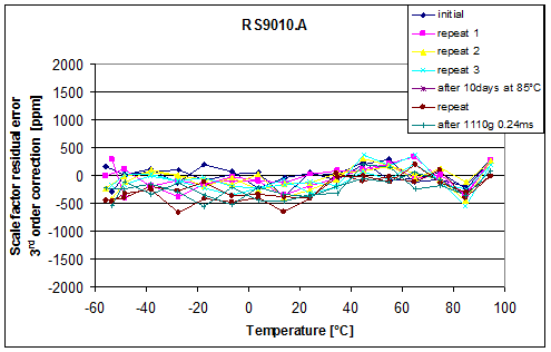 以下四張圖顯示了RS9010.A加速度傳感器的初步表現(xiàn)。我們可以看到,經(jīng)過沖擊和長期老化后,所有的零偏漂移包括遲滯都優(yōu)于1.5mg, 且標度因數(shù)穩(wěn)定性優(yōu)于150ppm. 此外,RS9010.A的振動整流誤差可比擬機電(Q-FLEX)規(guī)格。這些綜合性能使得RS9010.A成為未來的高性能航姿系統(tǒng)的最佳候選產(chǎn)品之一。