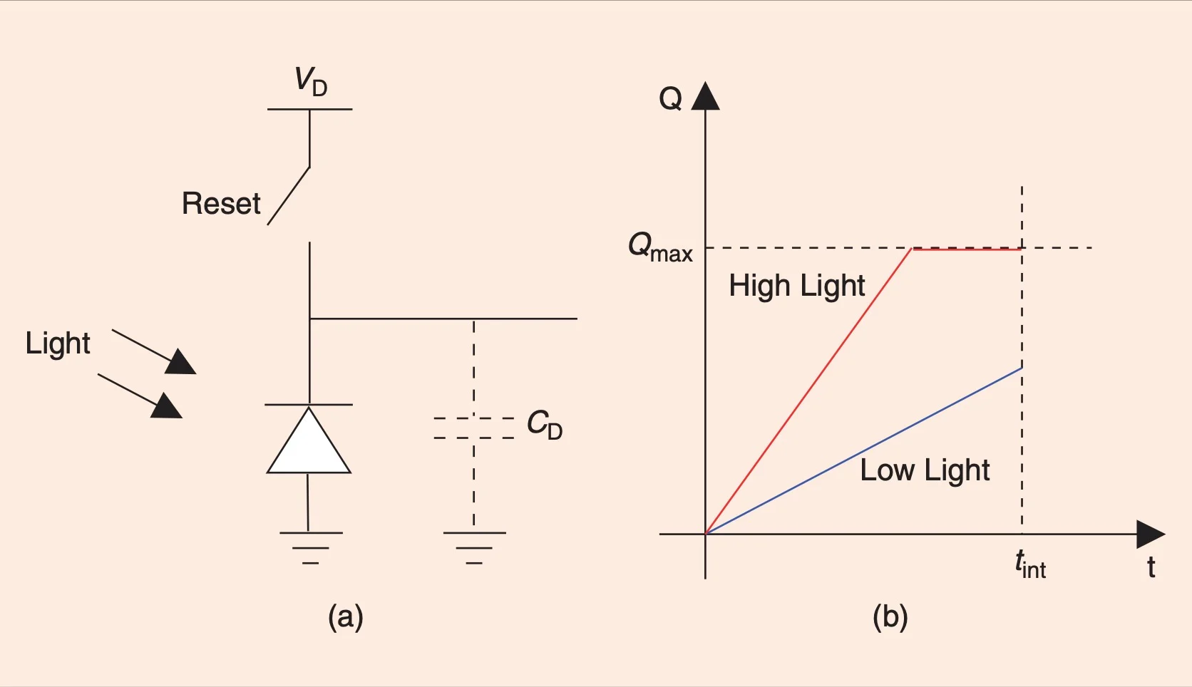 復(fù)位開關(guān)在曝光周期開始時(shí)閉合,以將光電二極管反向偏置到電壓 VD。接下來(lái),開關(guān)打開并產(chǎn)生與入射光強(qiáng)度成比例的光電流。該電流在毫微微安培到微微安培范圍內(nèi),并且太小而無(wú)法直接測(cè)量。如果我們讓光電二極管暴露在光線下一段設(shè)定的時(shí)間,著色,電流將在二極管電容 CD 上積分。存儲(chǔ)的電荷為我們提供了更容易測(cè)量的更強(qiáng)的累積信號(hào)。此外,所包含的平均過(guò)程使累積的信號(hào)更忠實(shí)地表示測(cè)量的光強(qiáng)度,尤其是在處理微弱或嘈雜的信號(hào)時(shí)。