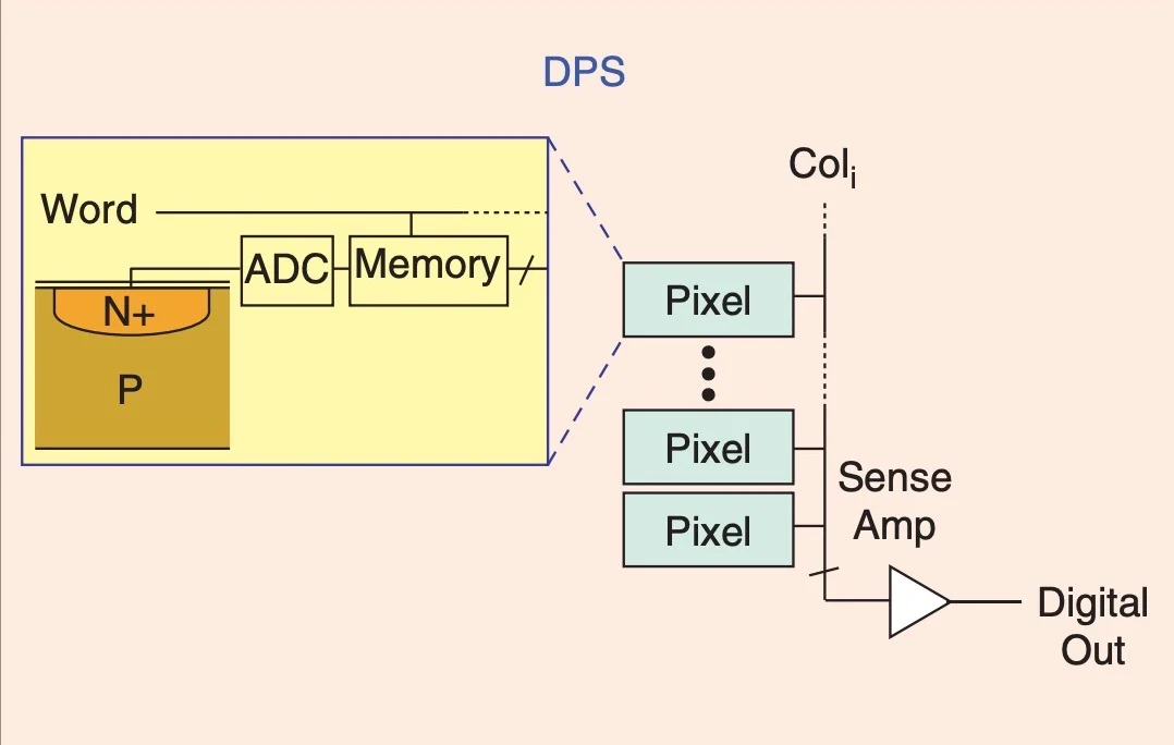 上圖顯示了一個(gè) APS(主動(dòng)像素傳感器)架構(gòu)。在 APS 器件中,每個(gè)像素位置不僅包含光電二極管,還包含放大器。一種更簡(jiǎn)單的架構(gòu),稱為 PPS(無(wú)源像素傳感器),不會(huì)將放大器集成到像素中。在 DPS(數(shù)字像素傳感器)設(shè)備中,每個(gè)像素都有自己的模數(shù)轉(zhuǎn)換器和內(nèi)存塊。因此,DPS 架構(gòu)中的像素輸出與光強(qiáng)度成比例的數(shù)字值。