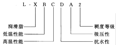 例:L-XEGHB2表示低溫-40℃,高溫180℃,在水洗條件下對淡水防銹,極壓型,稠度等級為2。