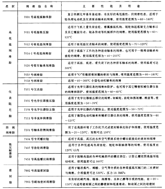 合成油經(jīng)稠化而成的潤滑脂統(tǒng)稱合成(油)潤滑脂,均系特殊性能的潤滑脂。表11為幾種合成脂的性能及主要用途。