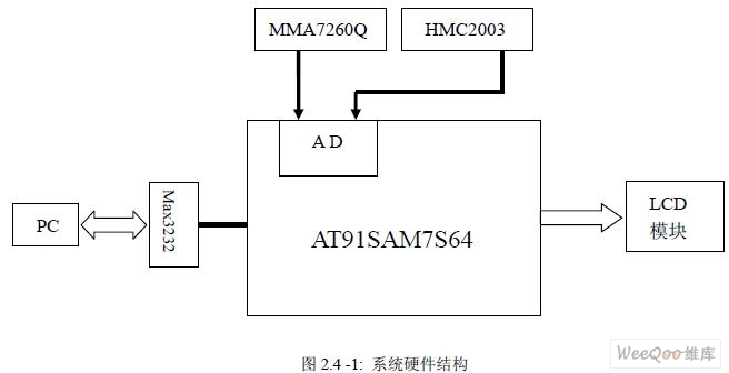 本系統(tǒng)的硬件結(jié)構如圖2.4 -1 所示。 由于At91sam7s64 具有片上A/D 轉(zhuǎn)換器而且具有8 選1 模擬復用器,使得MMA7620Q 和HMC2003 可以直接與微控制器相連而不必外加A/D 轉(zhuǎn)換器和復用器,不僅降低了系統(tǒng)的 成本和體積,提高了系統(tǒng)的集成度,同時減少了誤差源,提高了精度。經(jīng)過A/D 轉(zhuǎn)換的測量數(shù)據(jù)經(jīng)過ARM 核的處理后,被送到串口LCD 并通過RS232 接口送入PC 機進行進一步 的分析。