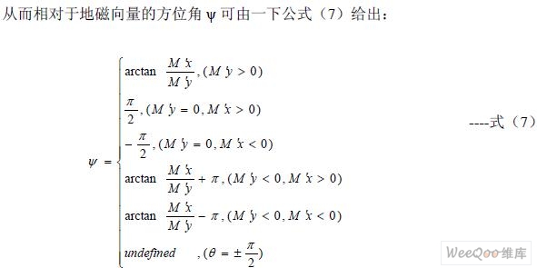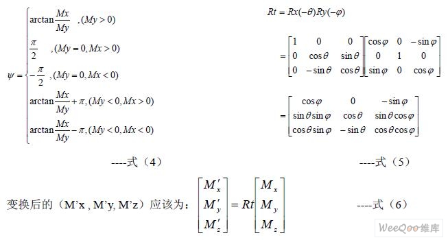 為了獲得系統(tǒng)相對于當?shù)氐卮畔蛄康姆轿唤,需要使用MR 傳感器的三個輸出Mx, My, Mz 。當系統(tǒng)置于水平狀態(tài)時(俯仰角和橫滾角都為0)時,方位角ψ 可以由公式(4)直 接給出,但是在大多數(shù)情況下,系統(tǒng)并不是工作在水平狀態(tài),此時地磁場的豎直分量將會影 響Mx 和My 的值,因此不能直接由公式(4)獲得相對于地磁向量的方位角。為了在所有 情況下都能獲得正確的方位角,必須將俯仰角和橫滾角考慮在內(nèi),即必須通過以俯仰角和橫 滾角為參數(shù)的坐標變換,將測得的(Mx, My, Mz)向量變換為與載體坐標系有相同方位角的 水平坐標系下的向量(M’x , M’y, M’z),其變換矩陣如公式(5)。