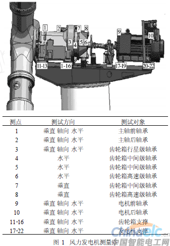 基于以上測點(diǎn)選取的原理,根據(jù)風(fēng)力發(fā)電機(jī)組的結(jié)構(gòu)特點(diǎn)、性能參數(shù)和工作原理,同時根據(jù)積累的現(xiàn)場測試經(jīng)驗(yàn),大致確定風(fēng)力發(fā)電機(jī)組的測試點(diǎn)如圖1所示。