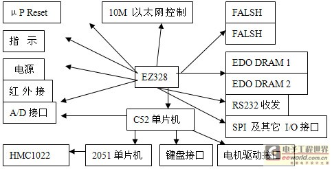 本文的課題背景是一個機器人玩具的控制系統(tǒng)設(shè)計,主芯片采用的是以摩特羅拉公司的MC86EZ328芯片,只完成與通信、運算等有關(guān)的主要操作,在沒有操作時,由運行于其上的操作系統(tǒng)uClinux來維護。對于所有與EZ328的核心運算、控制、通信、操作無關(guān)的外圍設(shè)備的維護和控制都通過一塊AT89C52來完成,它與EZ328的底層通信協(xié)議為同步串口協(xié)議(SPI),在AT89C52中由軟件來實現(xiàn)。C52包含的部件主要是A/D轉(zhuǎn)換器,鍵盤接口,電機驅(qū)動模塊。硬件結(jié)構(gòu)電路圖如下圖1: