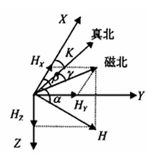 HMC的輸出電壓為磁場強度為0時傳感器的輸出。所以當U0為0時, Uout正比于磁場強度B。如圖4,假設(shè)機器人處于水平面上,X為機器人行進方向,Y為水平面上垂直X的方向向右(即X順時針轉(zhuǎn)90),地里北極方向和地磁北極方向如圖所示。H為地磁場,Hx、Hy分別是H在X、Y方向的水平分量, β為機器人行進方向和地磁北極方向的夾角, γ為地磁北極和地理北極方向的夾角,K就是機器人行進方向與地理北極方向之間的夾角,也就是我們最終要求的角度。(此處的β、γ、 K都是由前者出發(fā)順時針到達后者的角度)由圖可明顯看出,K= β-γ。而在地球上不同方位的γ可查表得出,所以關(guān)鍵就是求得 。由磁阻傳感器可以得出Hx、Hy,(此處忽略了機器人在Z軸方向的傾斜,所以二維傳感器就夠用了),。