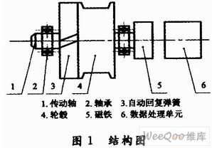 基于磁敏角度技術(shù)的拉線式位移傳感器的功能是將拉線的機(jī)械位移換成可以計(jì)量、記錄或傳送的電信號(hào),主要由自動(dòng)回復(fù)彈簧、輪轂、磁鐵以及數(shù)據(jù)處理單元等部分構(gòu)成,結(jié)構(gòu)如圖1所示。