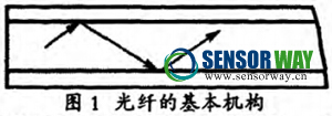 如圖1所示,光纖由高折射率的纖芯和包層兩部 分組成,纖芯的折射率大于包層的折射率,包層直徑 大致為0.1~0.2mm,光線(xiàn)通過(guò)端面透入纖芯,在與包 層的交界面處發(fā)生光線(xiàn)的完全內(nèi)反射,光線(xiàn)反射至纖 芯層,經(jīng)過(guò)不斷反射,光線(xiàn)沿著纖芯向前傳播。