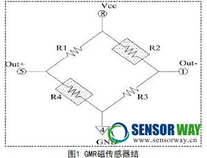 圖1中的R2和R4上的陰影部分是傳感器的合金屏蔽層,它有兩個作用:一是屏蔽外磁場對電阻R2和R4的影響,使其不能感應待測場的變化;二是作為一個磁通聚集器,將待測場聚集在R1和R3周圍,使傳感器輸出幅值增大,提高傳感器的靈敏度。