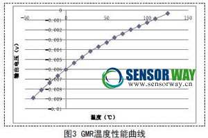 將GMR芯片放入高低溫無磁溫度箱中,每隔10℃記錄一次數(shù)據(jù),監(jiān)測傳感器從-40℃~+125℃隨溫度變化的漂移性,具體如圖3所示,芯片在整個溫度范圍內(nèi)輸出變化9.075mv,溫度系數(shù)為0.055mV/℃,可見GMR傳感器芯片的溫度性能比較優(yōu)越。