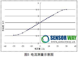 在實際應用中,待測電流有正負之分,產(chǎn)生的磁場有正負之分,因此,在測試過程中,通過改變磁場方向和電流的方向來檢測GMR傳感器和電流傳感器測試性能。圖5是電流從-30A到+30A變化時電流傳感器輸出曲線。