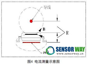 巨磁電阻用于電流檢測一般采用如圖4所示的方式進行,將磁傳感器放置通電導線的正上方或正下方,同時保證通電導線產(chǎn)生磁場的方向與磁傳感器的敏感方向一致。按照通電導線周圍產(chǎn)生磁場的理論計算公式2-1可知,在待測電流和傳感器相對位置一定的情況下,待測電流的大小和磁場大小成正比,利用公式2-2這樣就可以直接測量待測電流產(chǎn)生的磁場值,再結(jié)合公式2-1就得出待測電流的大小。