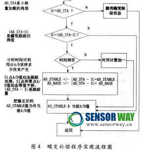 式(1)是加載到S1點天平的稱重值;式(2)是加載穩(wěn)定到S1點和進(jìn)行蠕變補(bǔ)償后天平的稱重值,式中載荷蠕變和受加載影響天平零點蠕變值同是ε。?蠕變跟蹤補(bǔ)償?shù)年P(guān)鍵是判斷和確定圖1所示的S1點、蠕變量ε與時間的關(guān)系,然后根據(jù)這一關(guān)系進(jìn)行蠕變補(bǔ)償。補(bǔ)償思路見圖4.圖4的前半段是確定S1點,后半段是蠕變跟蹤處理。這里的關(guān)鍵問題是如何確定蠕變跟蹤量和跟蹤時間的關(guān)系。圖1只定性地說明傳感器的蠕變特性,但是,每個傳感器都有定量的特性,也就是蠕變量ε與時間的關(guān)系。只有確定這一關(guān)系,才能確定蠕變跟蹤時間和跟蹤量(圖4中的AD_STA3)。解決的辦法是在天平標(biāo)定時一起確定蠕變曲線。具體做法是:加載砝碼標(biāo)定時按規(guī)程測試蠕變特性,單片機(jī)先記錄下S1點,并記錄每隔固定的時間段的當(dāng)前A/D值與S1點的差值,這就是該段時間的蠕變值。用軟件辦法記錄下這個傳感器蠕變量與時間的關(guān)系,然后再根據(jù)這一關(guān)系確定跟蹤量(AD_STA-3)和跟蹤時間。確定的原則是:固定的時間段蠕變量越大,跟蹤量(AD_STA-3)就越大和跟蹤間隔時間就越小。反之,跟蹤量(AD_STA-3)就越小和跟蹤間隔時間就越大。