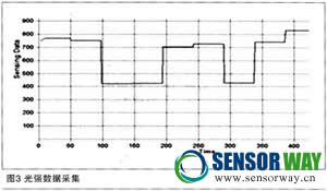 在我們?cè)O(shè)計(jì)的無線傳感器網(wǎng)絡(luò)中,普通節(jié)點(diǎn)將它采集的光強(qiáng)數(shù)據(jù)發(fā)送給網(wǎng)絡(luò)協(xié)調(diào)器,網(wǎng)絡(luò)協(xié)調(diào)器將含有控制變量的數(shù)據(jù)幀發(fā)送給帶有指示燈接點(diǎn)的同時(shí),還可以通過串口將光強(qiáng)度數(shù)據(jù)傳送給計(jì)算機(jī)。通過安裝存計(jì)算機(jī)上的后臺(tái)軟件,可以看出光強(qiáng)度信號(hào)的變化。如圖3所示,通過遮蓋光強(qiáng)傳感器可以改變采集到的光強(qiáng)數(shù)據(jù),當(dāng)光強(qiáng)度比較低時(shí)曲線下降,反之曲線上升。從圖3中,可以明顯看出,在這一段時(shí)間中傳感器被遮蓋了兩次。