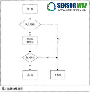 在整個(gè)無線傳感器網(wǎng)絡(luò)中,采取的是普通節(jié)點(diǎn)定時(shí)讀取其傳感器上的光強(qiáng)數(shù)據(jù),并將光強(qiáng)數(shù)據(jù)發(fā)送給中心節(jié)點(diǎn)。中心節(jié)點(diǎn)對(duì)接受到的數(shù)據(jù)進(jìn)行處理后傳送給相應(yīng)的節(jié)點(diǎn)用以控制其上的指示燈。在中心節(jié)點(diǎn)上的數(shù)據(jù)處理流程如圖2所示。