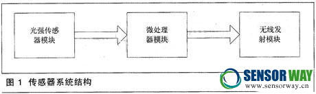 無線傳感器網(wǎng)絡(luò)平臺(tái)由光強(qiáng)傳感器模塊、微處理器模塊、無線發(fā)射模塊三個(gè)部分組成,如圖1所示。微處理器模塊和無線發(fā)射模塊集成在一塊板子上,而光強(qiáng)傳感器模塊通過接口與微處理器相連,這樣可以通過更換不同的傳感器模塊來應(yīng)用于各種場(chǎng)合。