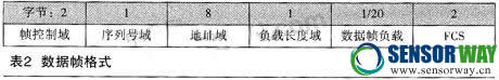 (2) 數(shù)據(jù)幀:用來傳送含有光強(qiáng)度信息的數(shù)據(jù)。數(shù)據(jù)幀的結(jié)構(gòu)如表2所示,在幀控制域中定義了幀的類型為數(shù)據(jù)幀。