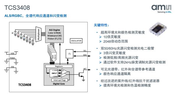 為了降低這一干擾,傳感器解決方案供應商ams為我們帶來了全新的TCS3408顏色傳感器。它的靈敏度更高,可用于測量環(huán)境光的色溫和光強,還可以檢測光學的物理閃爍,能讓手機攝像頭消除人造光源導致的照片缺陷。