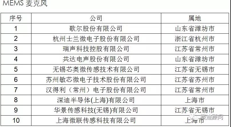 國內(nèi)MEMS細(xì)分領(lǐng)域優(yōu)秀企業(yè)(排名不分先后)