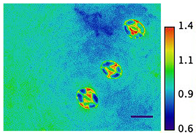 該圖像描繪了三個擬南芥葉表面的孔或氣孔,它們表達了由加州大學圣地亞哥分校的植物生物學家開發(fā)的新型SNACS應力納米傳感器。圖片來源:圣地亞哥加州大學施羅德實驗室
