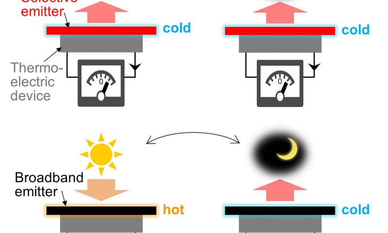 在本周于《應(yīng)用物理學(xué)快報》上發(fā)表的一項研究中,作者測試了一種由波長選擇發(fā)射器組成的熱電設(shè)備,該設(shè)備在白天使用輻射冷卻不斷地冷卻該設(shè)備,使熱能從設(shè)備中散布到空氣中。結(jié)果,設(shè)備的頂部比底部的溫度更低,從而導(dǎo)致溫差,從而在白天和黑夜以及各種天氣條件下產(chǎn)生恒定電壓。