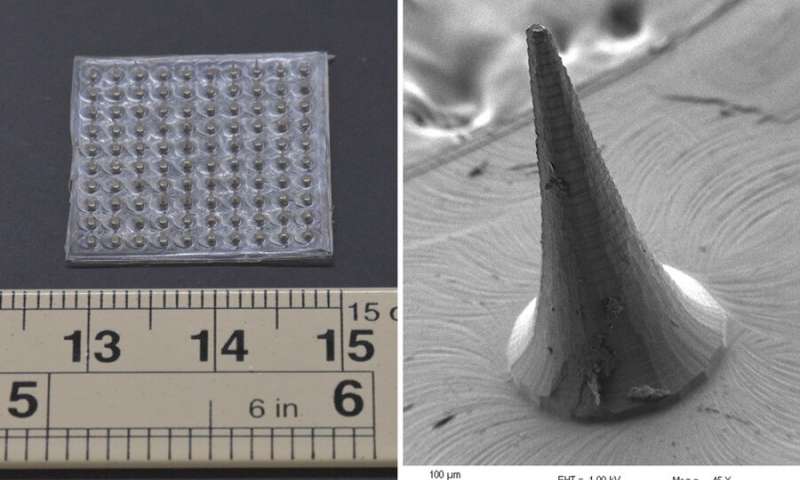 在左側(cè),您可以看到具有100針的微針陣列的示例。右邊是單針的SEM圖像。圖片來源:麻省理工學(xué)院