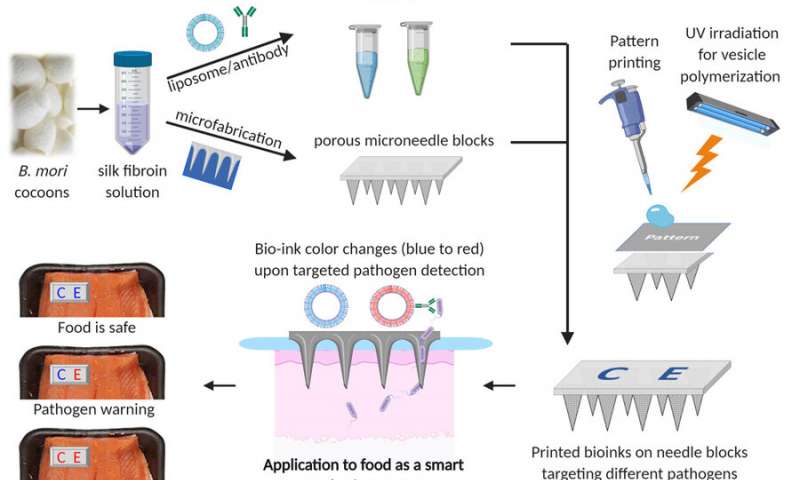 該示意圖說明了擬議的食品質(zhì)量監(jiān)控系統(tǒng),該系統(tǒng)使用帶有打印生物墨水的絲綢微針陣列作為比色傳感器。圖片來源:麻省理工學(xué)院