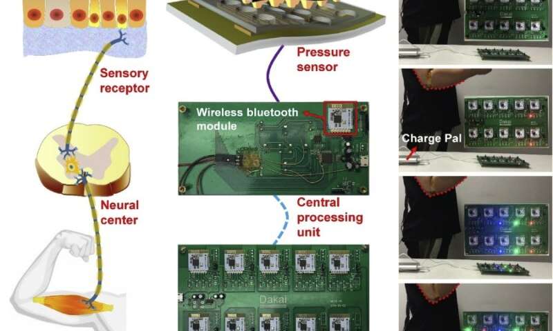 該團隊還設計了一個人工體細胞反射弧,以模仿生物系統中的反應。傳感器安裝在志愿者的肘部。隨著志愿者增加彎曲角度,信號通過無線藍牙模塊傳輸到功能單元,功能單元中的LED點亮量也增加。