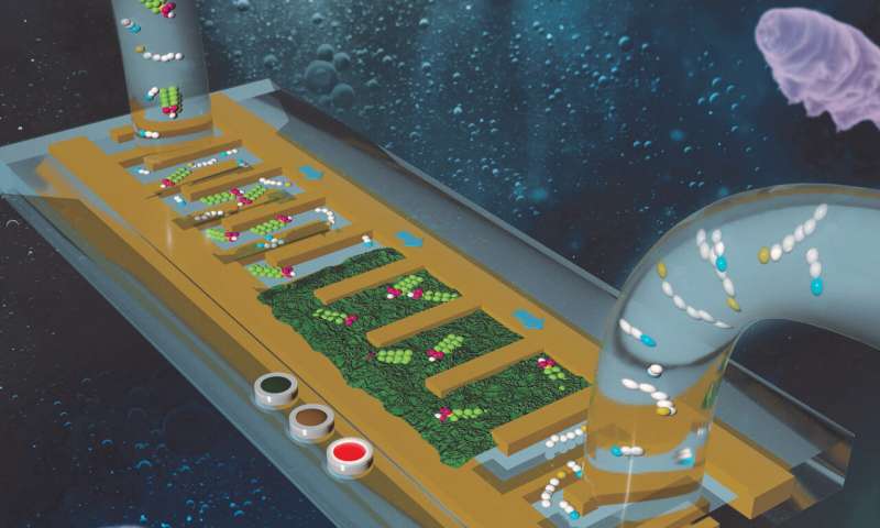 傳感器看起來(lái)像一個(gè)顯微鏡載玻片,上面有一個(gè)曲折的小迷宮。水樣本流過(guò)迷宮,并進(jìn)入中間的海綿狀材料。水樣本中的任何PFOS或PFAS分子都被海綿捕獲,而其他分子則通過(guò)。