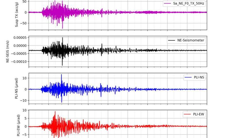 對于8月17日意大利北部發(fā)生的地震,PLI(下兩個(gè)圖)采集的信號與處女座上已安裝的設(shè)備(上兩個(gè)圖)相同。圖片來源:Beniamino Di Girolamo / CERN
