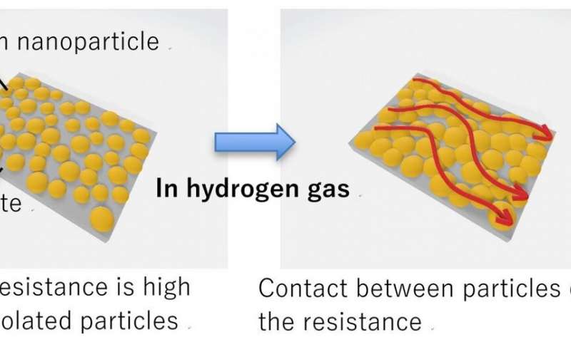 使用鈀納米顆粒進(jìn)行氫感測的示意圖。如果沒有氫存在,金屬鈀納米粒子(橙色點(diǎn))將充當(dāng)孤立的島,電流將不會(huì)輕易流過器件。相反,當(dāng)設(shè)備暴露于少量氫氣時(shí),氫原子可以橋接島之間的間隙,從而形成一個(gè)連通的網(wǎng)絡(luò),使大電流通過(紅線)。學(xué)分:大阪大學(xué)