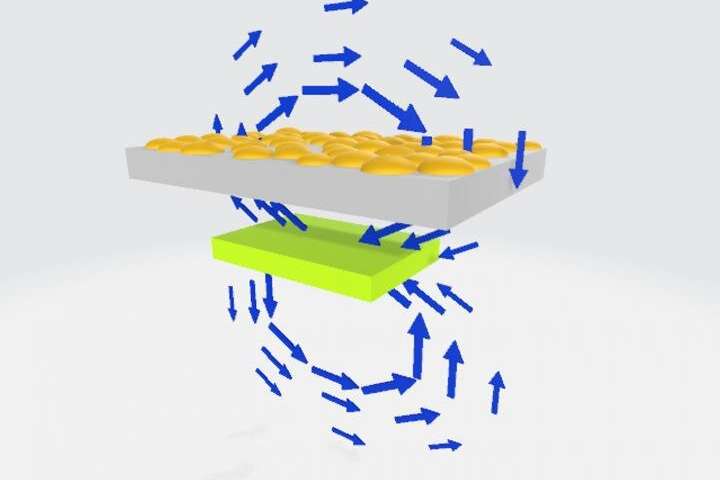 在設(shè)備制造過程中如何使用壓電共振來評(píng)估鈀顆粒之間的分離的圖示。當(dāng)將鈀納米顆粒(黃色)添加到樣品中時(shí),振動(dòng)的壓電材料(綠色長方體)在基板(灰色)表面附近產(chǎn)生交變電場(藍(lán)色箭頭),從而在沉積的鈀(橙色顆粒)中產(chǎn)生電流。這導(dǎo)致壓電材料的一些振動(dòng)能量損失。當(dāng)鈀顆粒彼此接觸時(shí),能量損失的值最大,因此可以在最佳納米顆粒濃度下停止沉積。