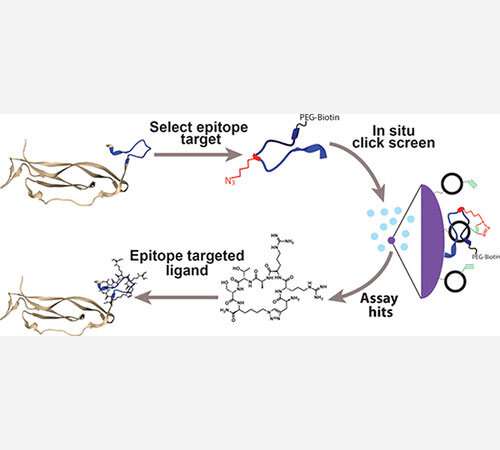 通過(guò)使用大型肽庫(kù),對(duì)蛋白質(zhì)靶標(biāo)進(jìn)行廉價(jià),高度穩(wěn)定和模塊化的基于肽的合成親和劑(PCC)的快速開(kāi)發(fā)過(guò)程。信用:經(jīng)Heather D. Agnew等的許可轉(zhuǎn)載。