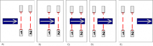 圖1.運(yùn)動(dòng)方向傳感器的原理:A)待機(jī)–對(duì)象從左側(cè)接近傳感器,B)傳感器“ 1”處于活動(dòng)狀態(tài),C)傳感器“ 1”和“ 2”處于活動(dòng)狀態(tài),D)傳感器“ 2”處于活動(dòng)狀態(tài), C)待機(jī)模式
