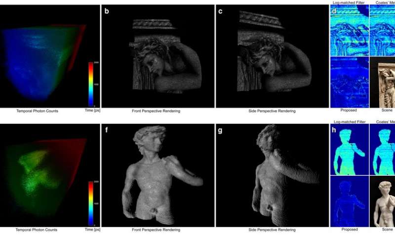 實(shí)驗(yàn)重建。記錄的光子計數(shù)的時空分布。對(a,e)進(jìn)行處理以估計包含深度和反照率信息的3D點(diǎn)云(b,c,f,g),此處針對兩個不同場景進(jìn)行了顯示((d,h)中所示的照片)。用顏色編碼的誤差圖(d,h)直接比較幾種深度估計技術(shù)的結(jié)果,包括對數(shù)匹配濾波,Coates方法和高斯擬合(在高通量測量中),以及所提出的方法。圖片來源:Scientific Reports,Doi:10.1038 / s41598-018-35212-x